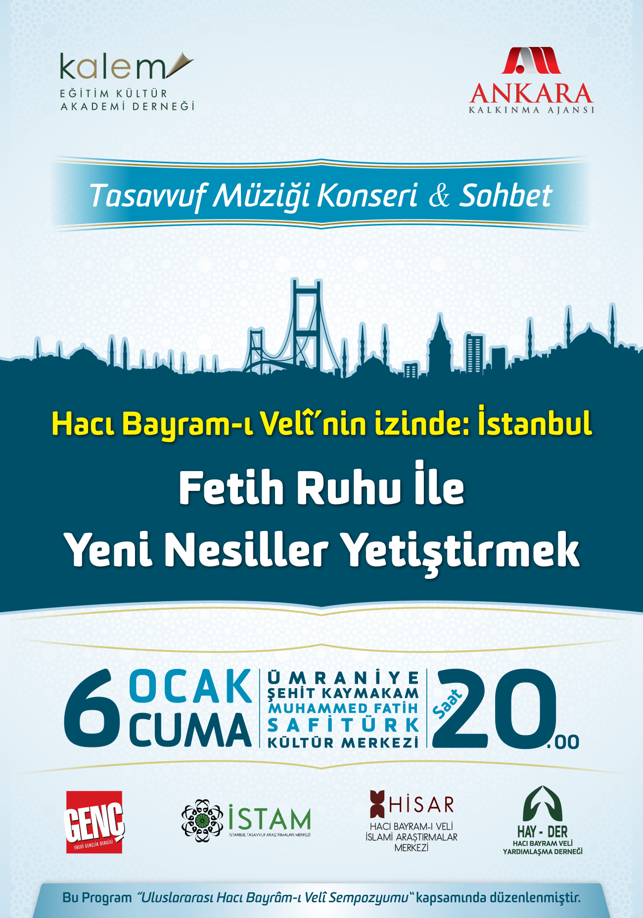 Kalem Eğitim Kültür Akademi Derneği tarafından 25-26 Mayıs 2016 tarihleri arasında Ankara`da gerçekleşen Uluslararası Hacı Bayrâm-ı Velî Sempozyumu kapsamında; Uluslararası Genç Derneği, İstanbul Tasavvuf Araştırmaları Merkezi (İSTAM), Hacı Bayram-ı Veli İslami Araştırmalar Merkezi (HİSAR) ve Hacı Bayram Veli Yardımlaşma Derneği`nin (HAY-DER) katkılarıyla 6 Ocak Cuma günü Tasavvuf Müziği Konseri ve sohbet programı düzenlenecek.