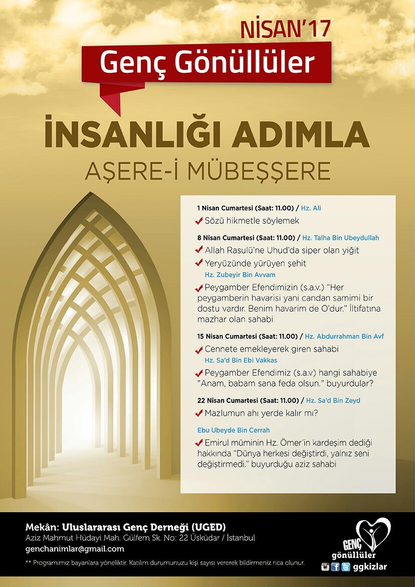 “Ashabım yıldızlar gibidir, hangisine uyarsanız doğru yolu bulursunuz.” buyuran Efendimiz sallallahu aleyhi vesellem’in güzide arkadaşlarını tanımaya Nisan ayında da devam ediyoruz. Saliha Gündüz Hanımefendiden dinleyeceğimiz derslerimiz her hafta Cumartesi günü Uluslararası Genç Derneği`nde gerçekleşecek.