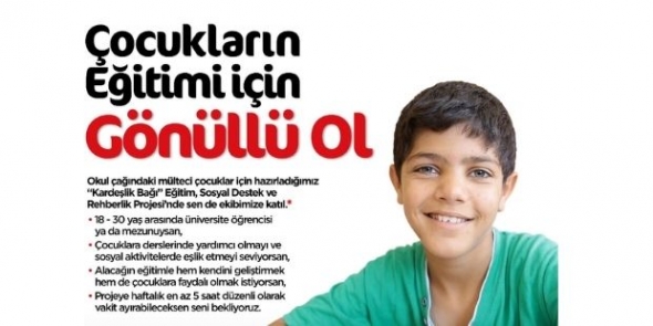 Mülteci çocuklara verilecek eğitim, sosyal destek ve rehberlik çalışmalarında; 18-30 yaş aralığında üniversite öğrencisi yahut mezunu olan, projeye haftalık en az 5 saat ayırabilecek, alacağı eğitimle hem kendini geliştirmek hem de çocuklara faydalı olmak isteyen kardeşlik bağı gönüllüleri aranmaktadır. Son başvuru tarihi 30 Eylül 2020'dir.