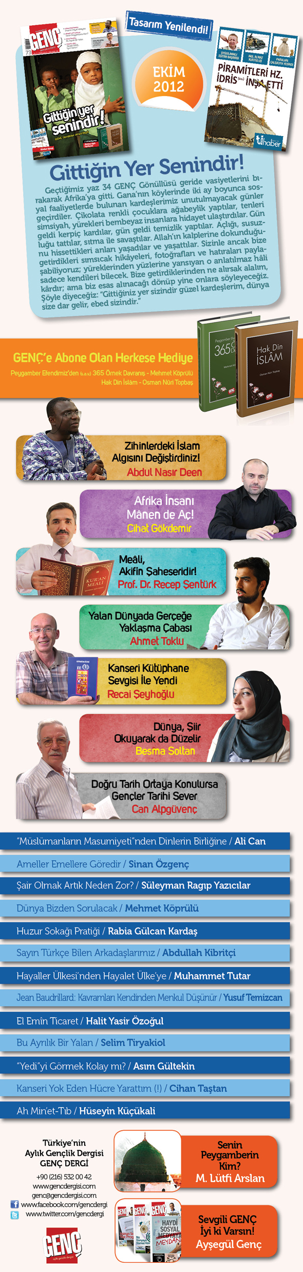 Geçtiğimiz yaz GENÇ Gönüllüler Afrika çıkarması yaptılar. 34 kardeşimiz Gana’da İsa ve Nasrüddin Bey gibi dostlarımızın yardım ve vesilesi ile çok bereketli sosyal sorumluluk projelerine imza attılar. Dosya konumuz bu güzel seyahatin gönle sürur veren mahsullerinden faydalanarak hazırlandı. Kardeşlerimizin dönüşlerinde getirdikleri enerji, sözlerindeki heyecan, gönüllerindeki duruluk, bize verdikleri yazı, fotoğraf ve tespitlere de yansıdı. Biz, dosyayı hazırlarken çok istifade ettik, onlardan mülhem bir ifade ile Rabbimizin kalplerimize dokunduğunu hissettik. Eminiz ki siz de aynı şeyleri hissedeceksiniz.