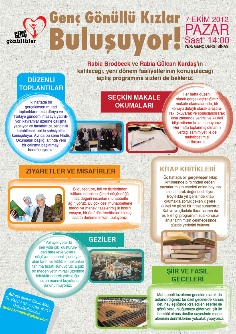 İstanbul’daki Genç Gönüllü Kızlar olarak, yeni dönem açılışımızı 7 Ekim Pazar günü, Genç Dergi binasında, saat: 14:00’de yapacağız.
