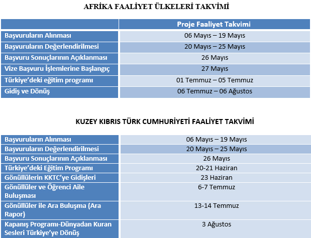 Gana, Uganda, Tanzanya, Burkina Faso ve Kuzey Kıbrıs Türkiye Cumhuriyeti ülkelerinden her hangi birine gidecek olan gönüllülerimiz bu ülkelerde 30 gün kalacaklar.