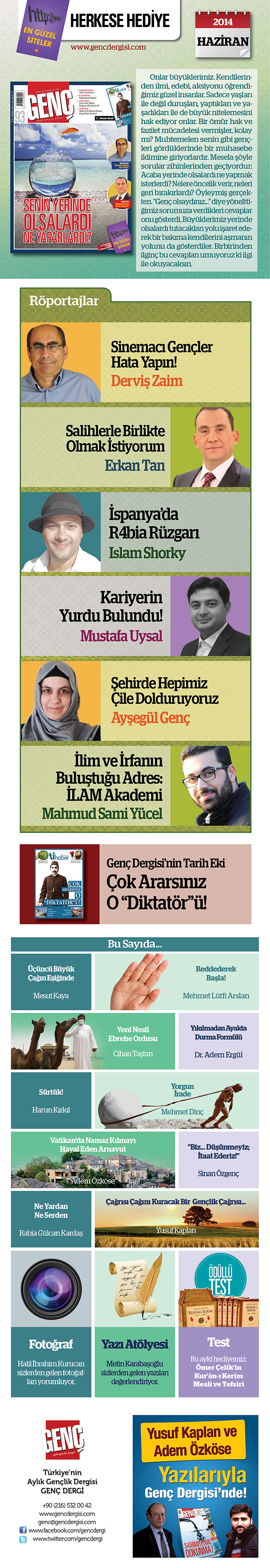 Merhaba değerli GENÇ okurları, 2014 yaz mevsiminin ilk sayısını da sizler için hazırlamış bulunuyoruz. Bu ay tam 6 adet röportaj var Genç Dergi`de. Ayrıca hediye olarak "En Güzel Siteler" kitapçığımız var. Bu kitapçıkta birçok kaliteli ve kullanışlı internet sitesini bulabilirsiniz.