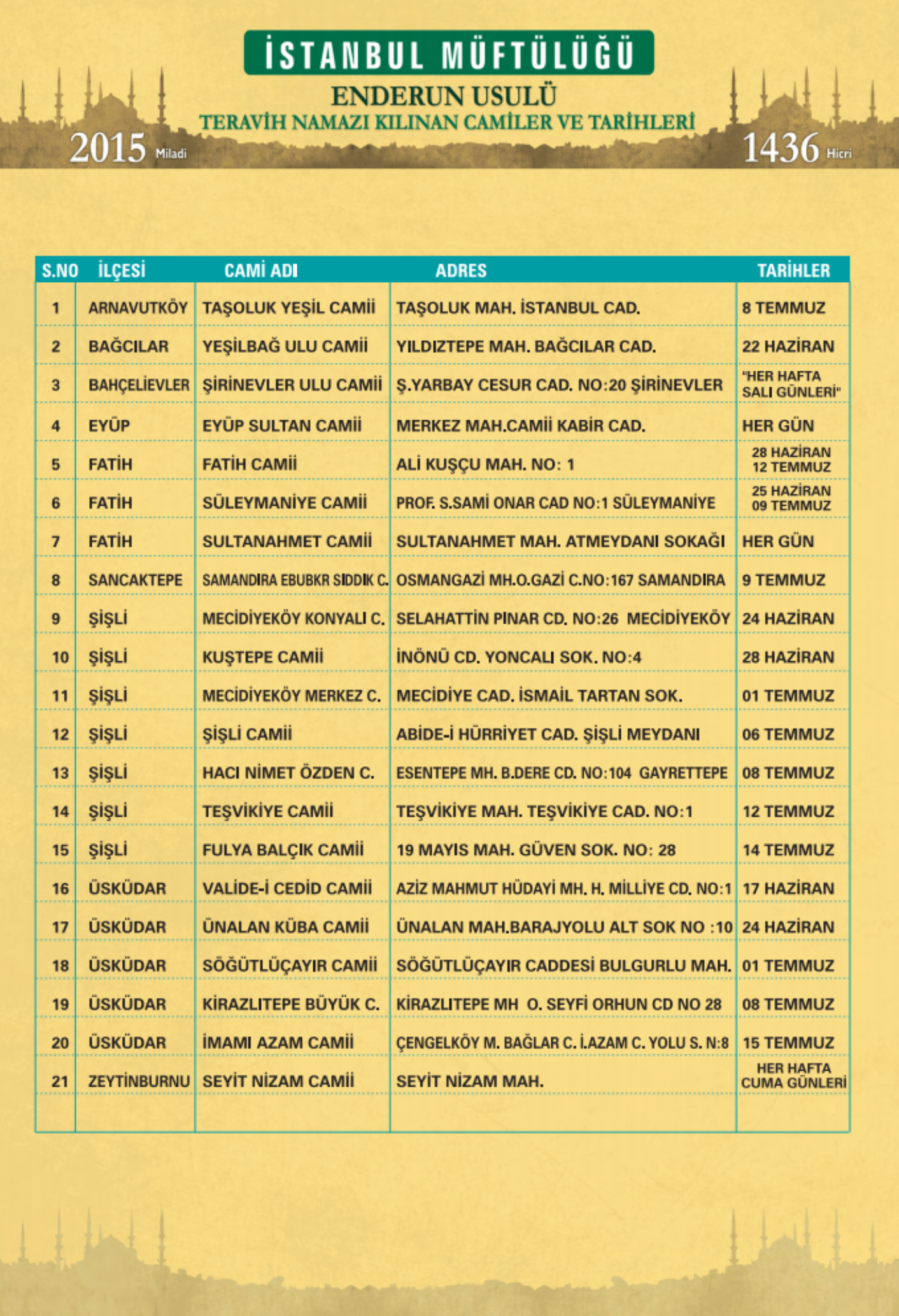 Türkiye genelinde 651 camide hatimle teravih namazı kılınıyor. Konya 63 cami ile ilk sırada yer alırken, İstanbul`da 57, Ankara`da ise 45 camide hatimle teravih namazı eda ediliyor.