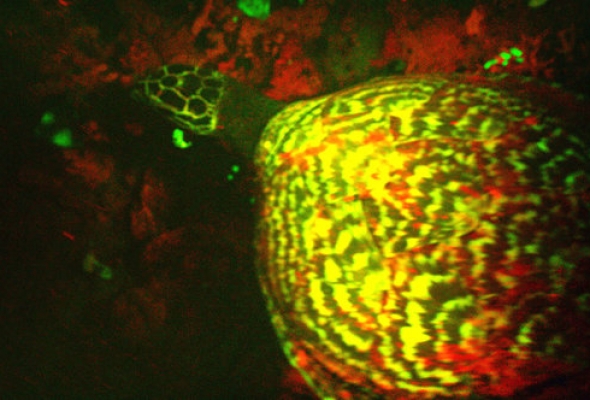 Solomon Adaları yakınlarında biliminsanları çok ilginç bir keşfe imza attı. Görüntülenen deniz kaplumbağasının yeşil ve kırmızı renkte floresan ışıldaması yaptığı gözlemlendi.